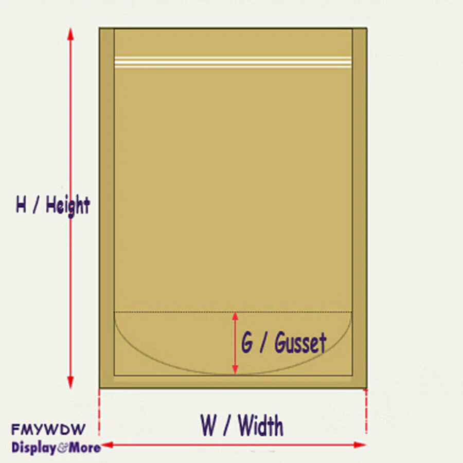 Pouch size in External Measurement: Width x Height + Gusset.